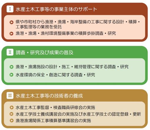 ○ 水産土木工事の設計・積算・施工監理・検査等に関する調査・研究・普及、技術者 養成、業務受託等を行っています。 ○ 都道府県や市町村において技術者が不足している時、繁忙期、難しい問題を抱えた時 などに、設計、積算、施工監理業務のお手伝いをします。